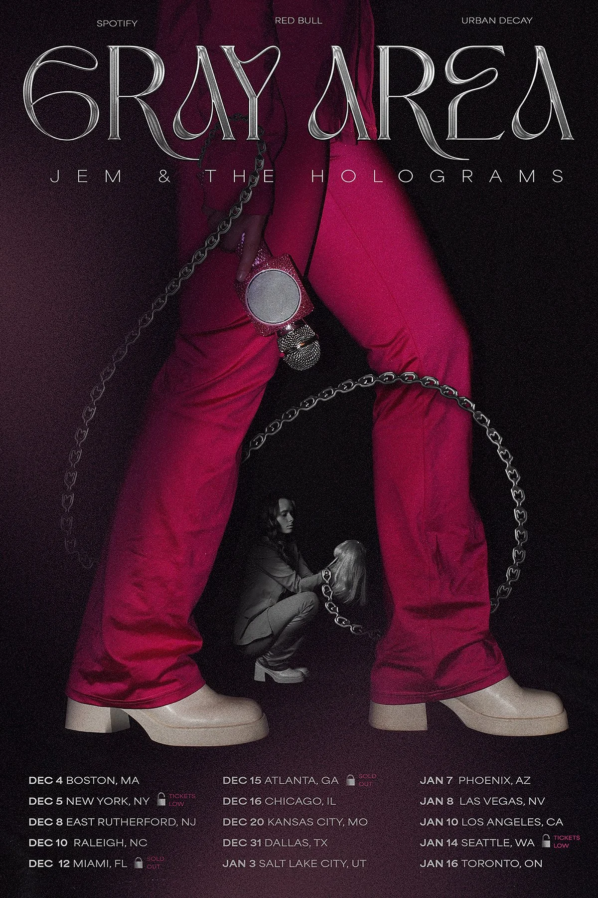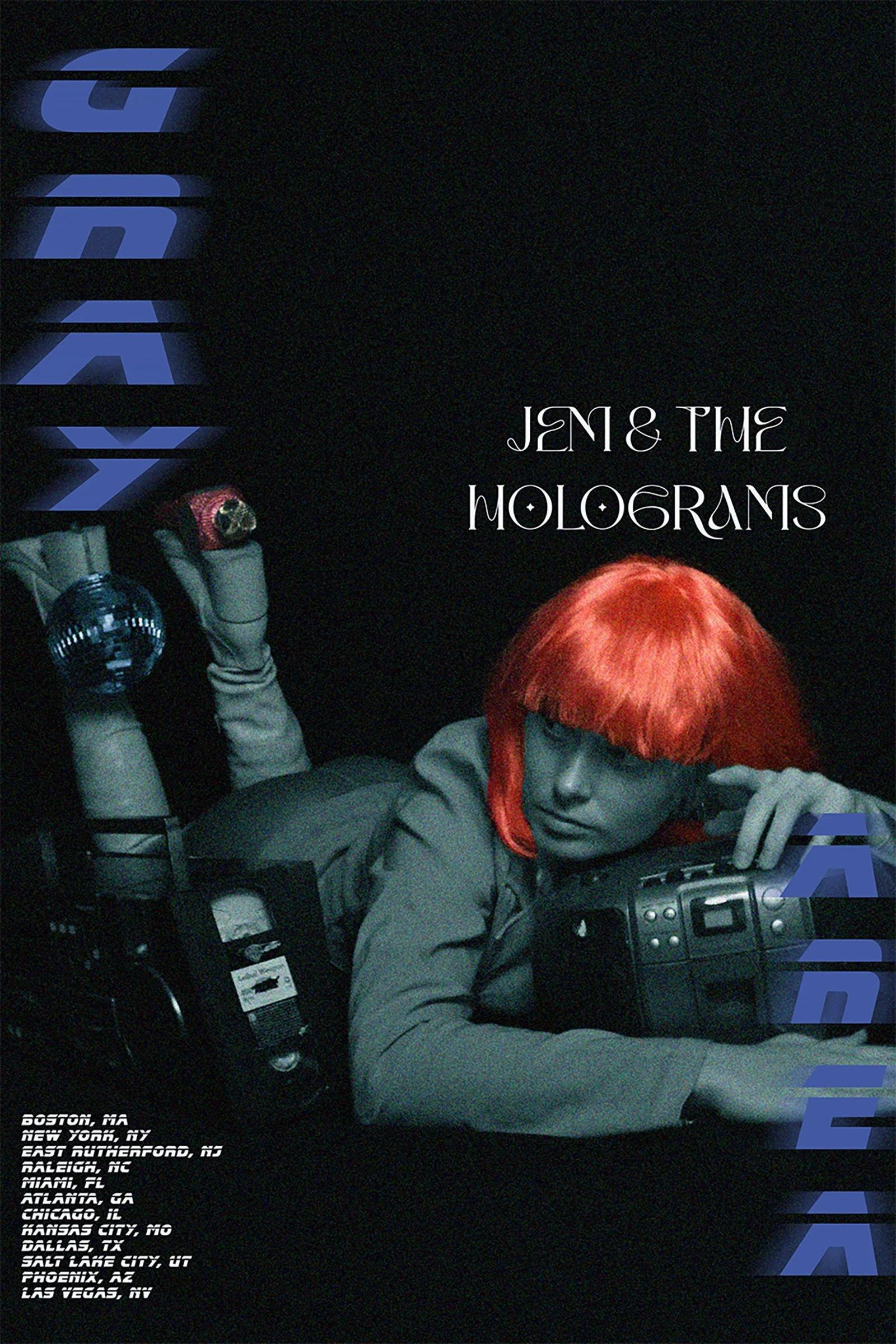 Gray Area is a surreal tour poster created for the fictional band Jem & The Holograms. This project explored concept development, collaboration, photography, and experimental design. I collaborated with fellow Penn State graphic design student Karolina Ptakowski. The title was chosen at random, and the concept was developed from it. The poster examines how the persona of a pop star can convey a sense of being trapped, using photography, editing, and experimental approaches to scale and typography to emphasize this feeling and create a distinctly surreal effect.